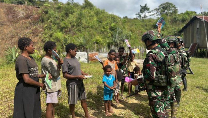 PEGUNUNGAN BINTANG – Dalam upaya menumbuhkan semangat belajar anak-anak di perbatasan, Pos Melky Satgas Pamtas RI-PNG Statis Yonif 753/AVT membagikan alat tulis kepada anak-anak di Kampung Melky, Kabupaten Pegunungan Bintang, pada Senin (23/6/2025).